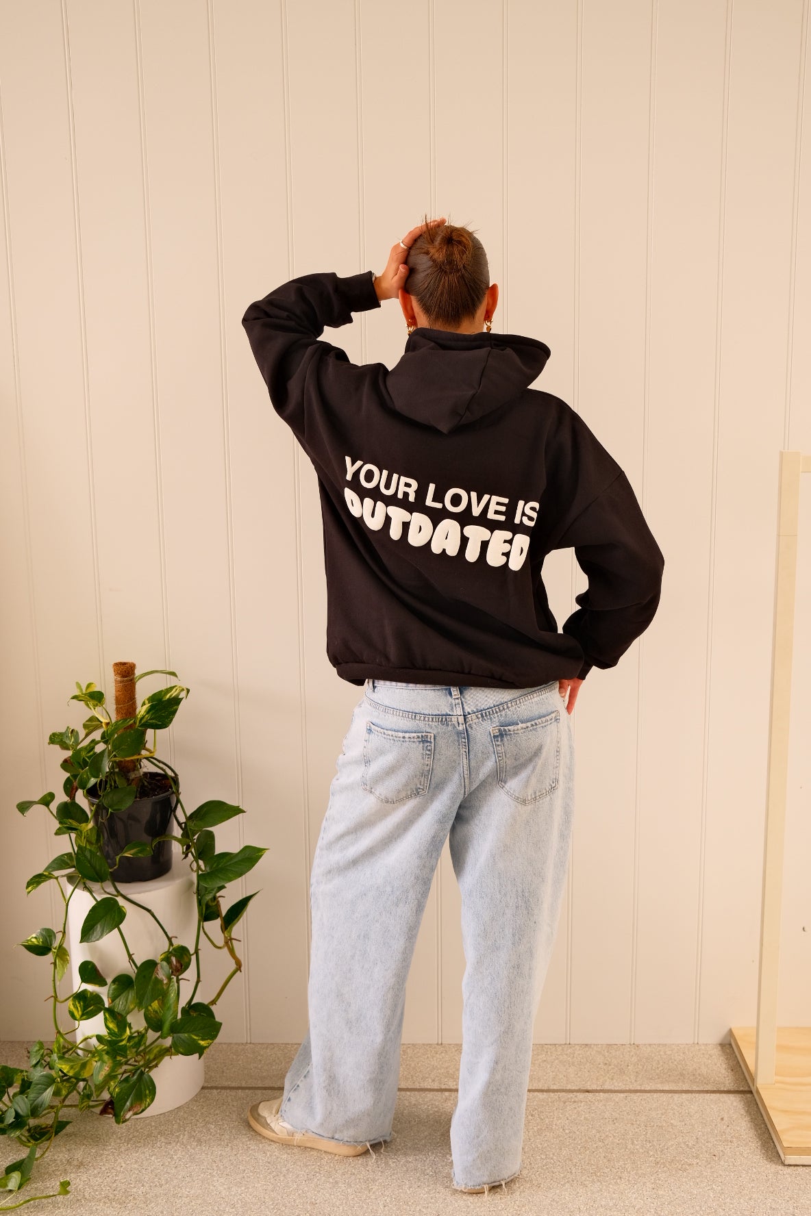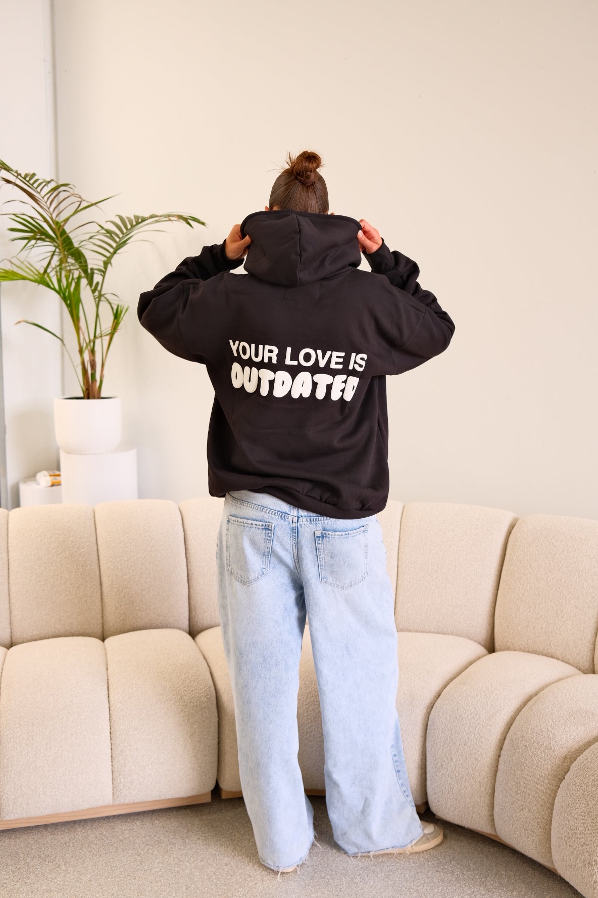 A high-demand staple, this standard-fit premium cotton-poly blend hoodie features a kangaroo pouch pocket and the iconic ‘Your Love is Outdated’ design on the back. Comfort meets timeless style—don’t miss out.