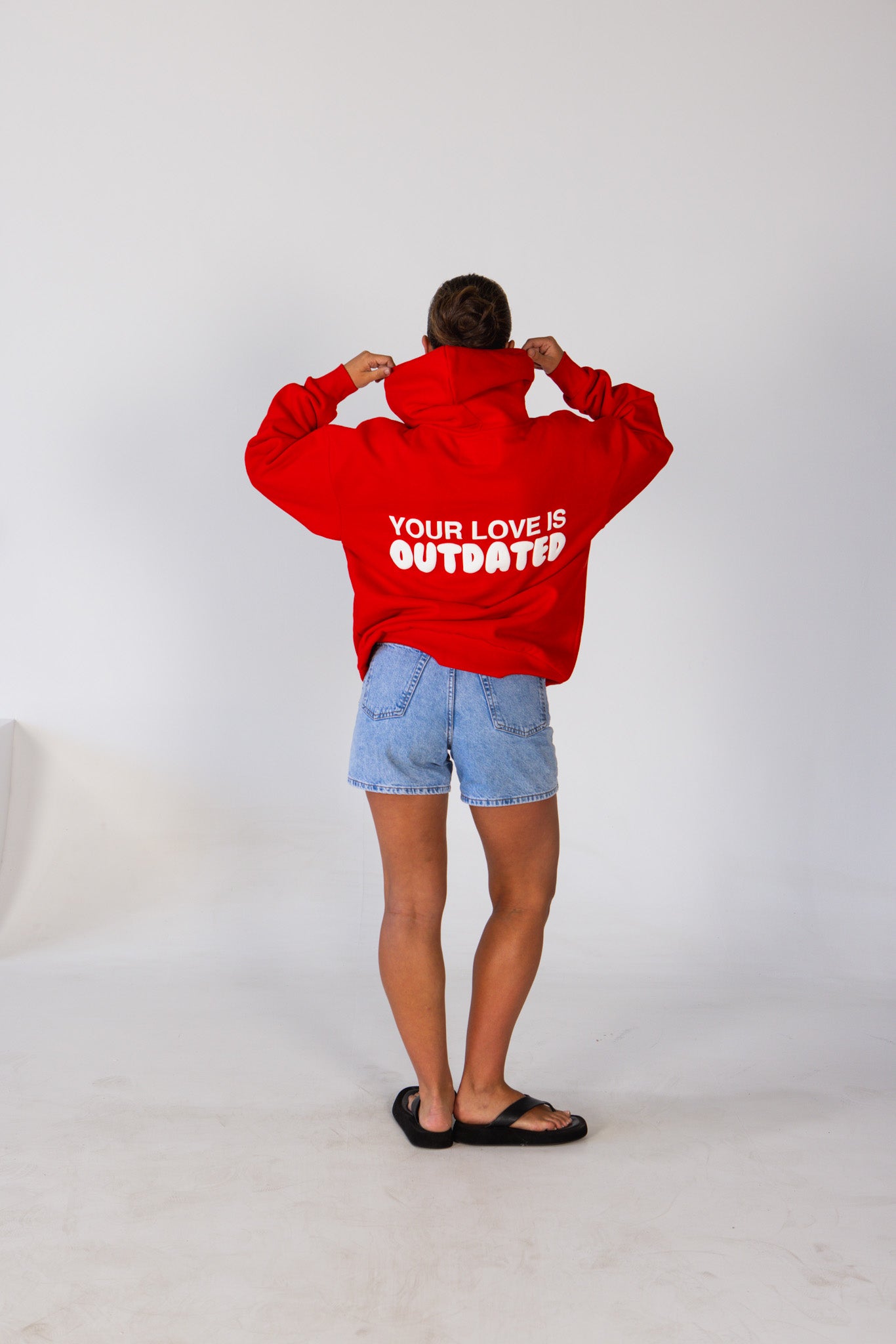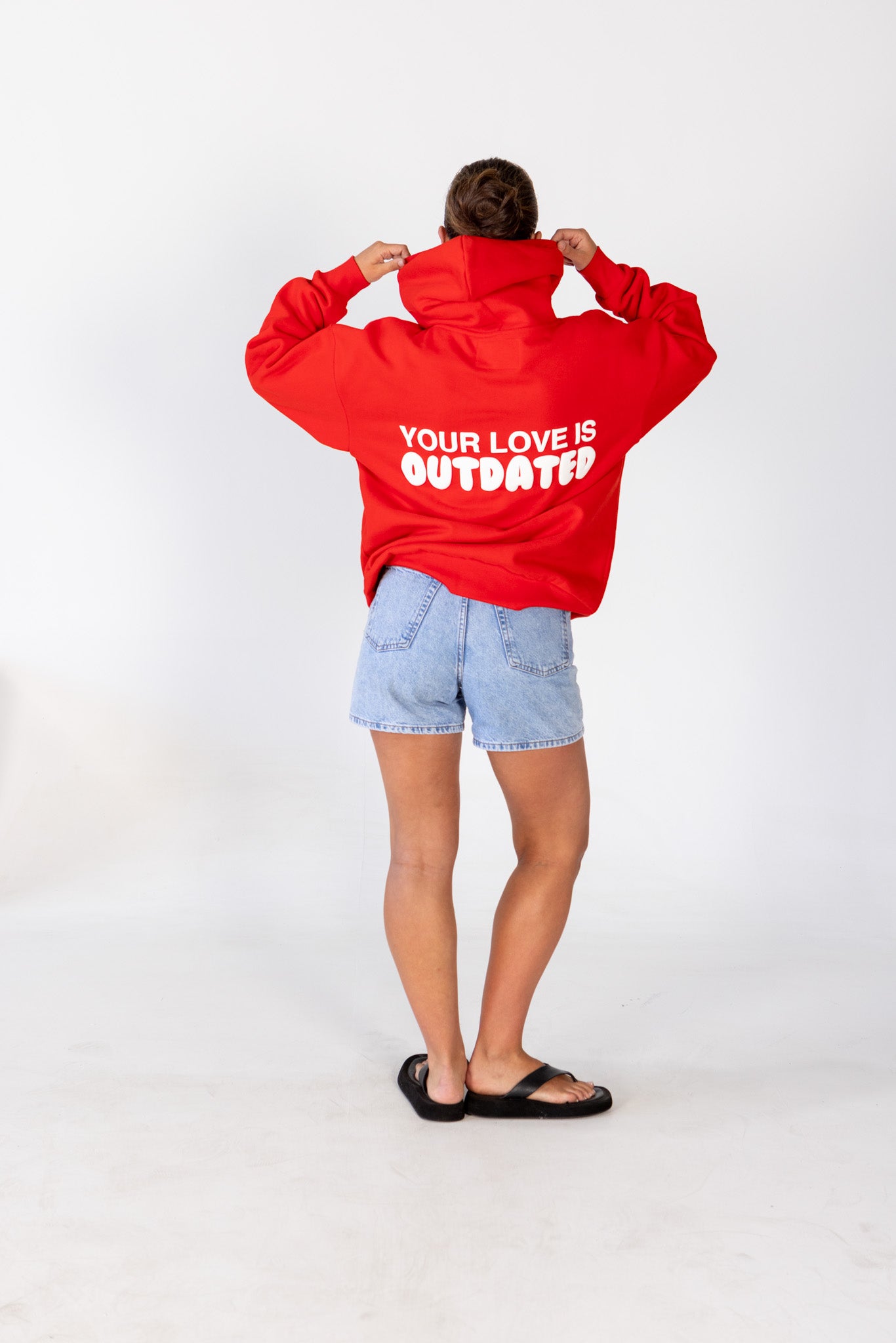 A high-demand staple, this standard-fit premium cotton-poly blend hoodie features a kangaroo pouch pocket and the iconic ‘Your Love is Outdated’ design on the back. Comfort meets timeless style—don’t miss out.