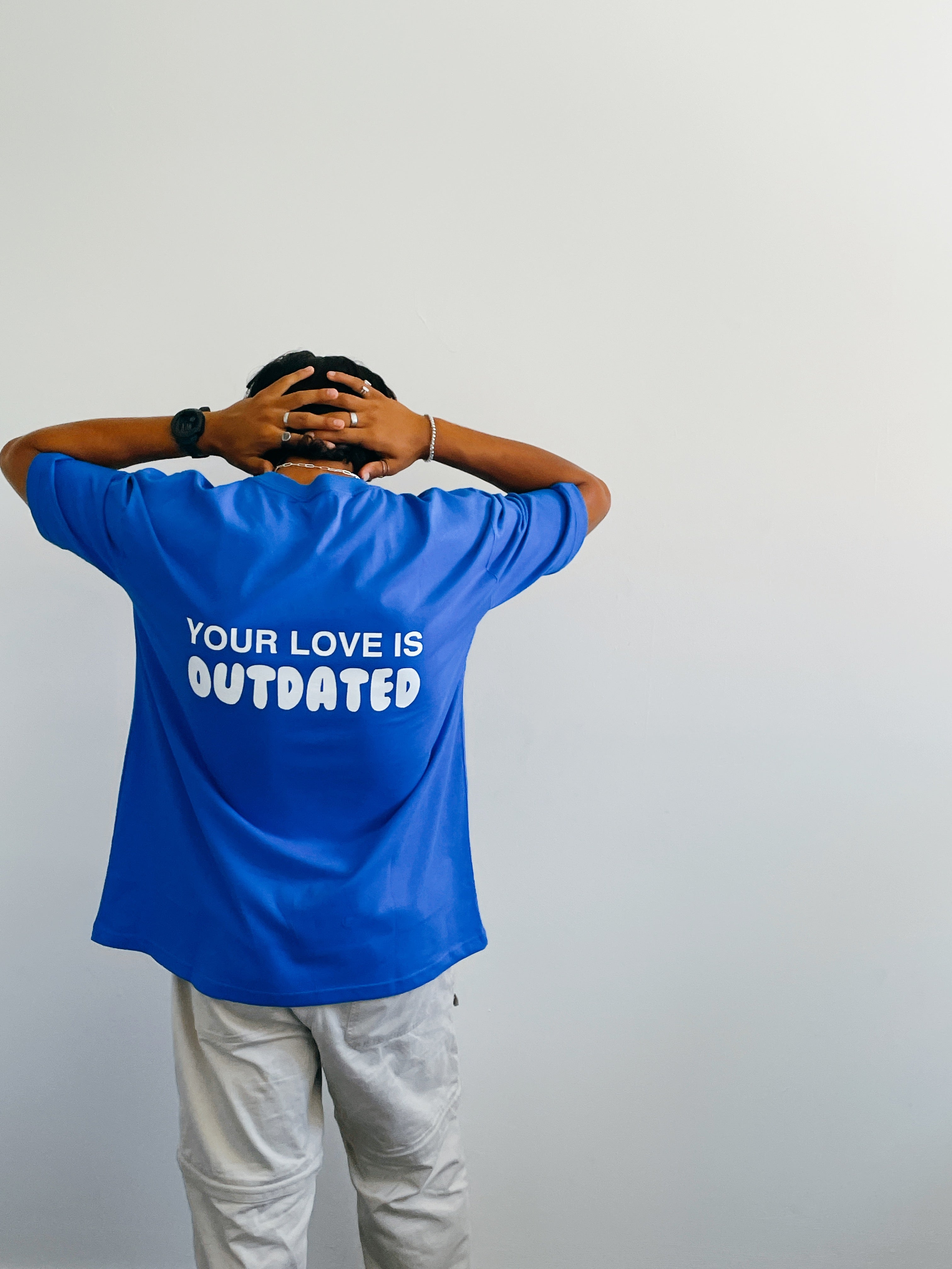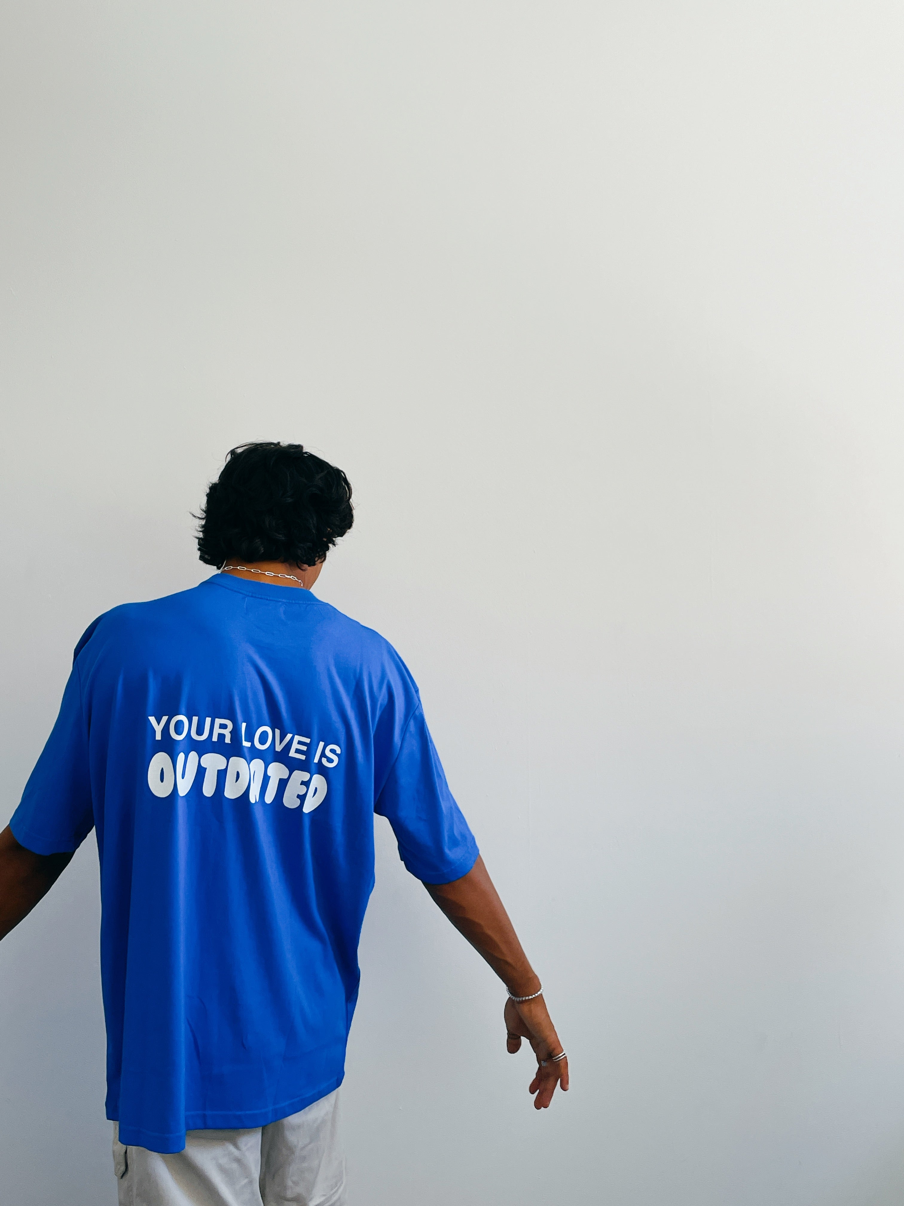 Royal Blue Tee with "Your love is Outdated" print on the back.
