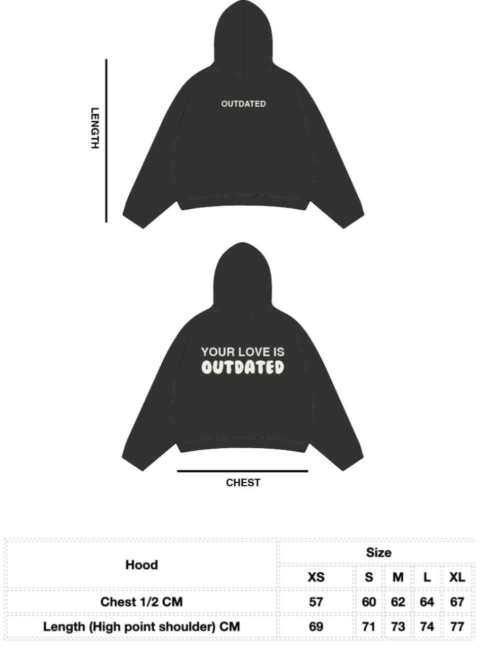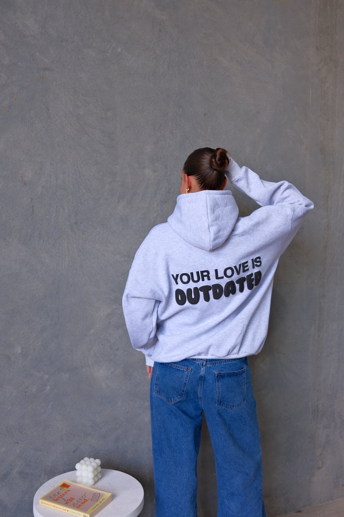 A high-demand staple, this standard-fit premium cotton-poly blend hoodie features a kangaroo pouch pocket and the iconic ‘Your Love is Outdated’ design on the back. Comfort meets timeless style—don’t miss out.